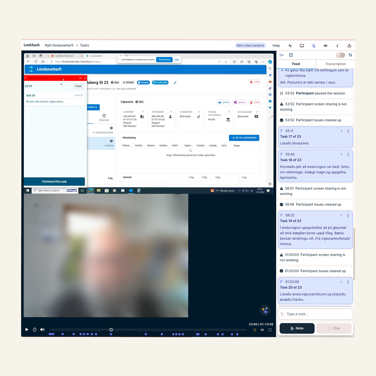 Verkefnin ákveðin í samvinnu við starfsfólk Fiskistofu og stillt upp í Lookback, kerfinu sem notað var við prófunina.