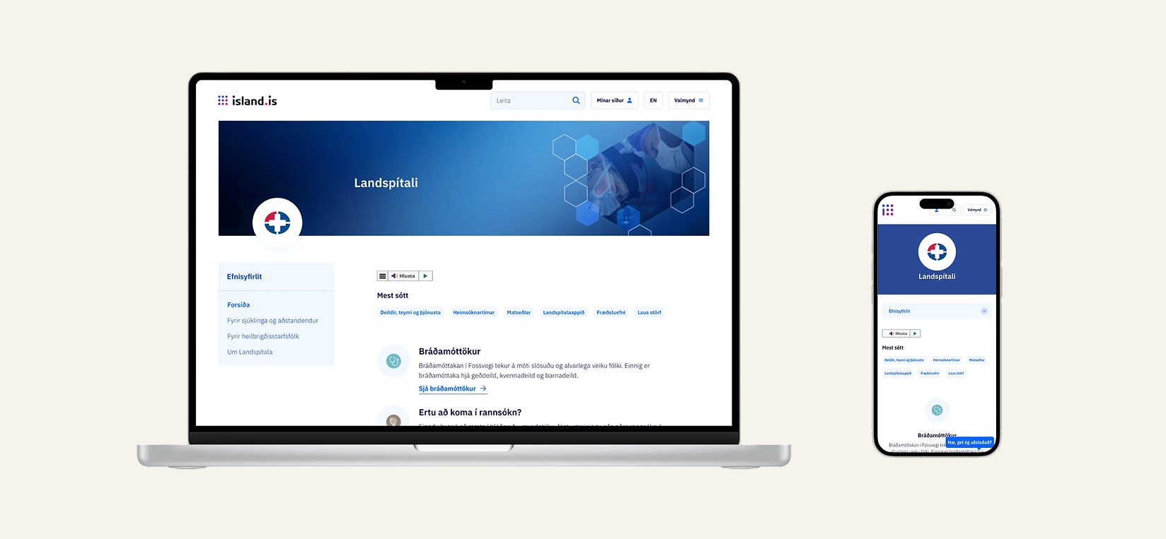 Fyrir hönd Stafræns Íslands vann Stefna náið með tengiliðum Landspítala við rannsóknir og greiningu, grisjun, hönnun, efnisvinnu og þýðingar á vefnum.
